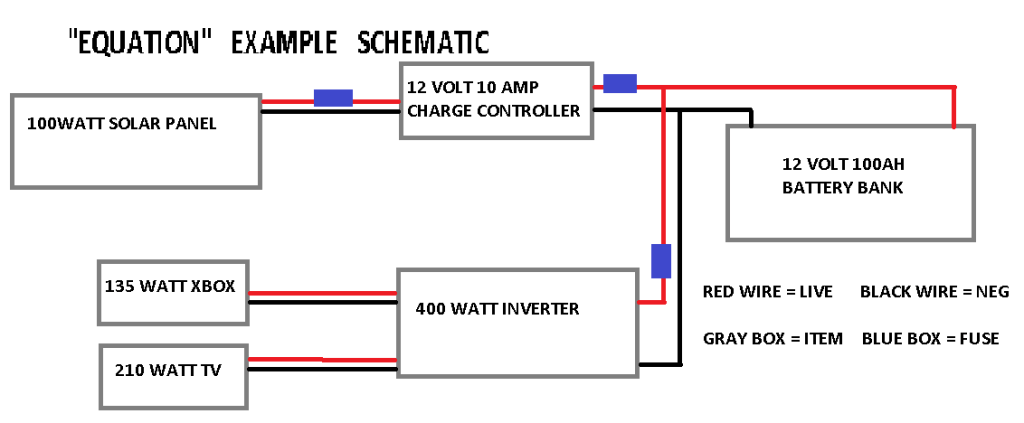 Let us say you want to run an 135 watt Xbox 360 and a 210 watt TV, I would round this to 150 and 250 just to have flexibility. To find out your inverter size, all you need to do is add them together, 150 watts + 250 watts = 400 watts. A 400 watt inverter is adequate for this system. On a side note, there are two different kinds of inverters, Pure Sign Wave and Modified Sine Wave. Some people recommend pure sign wave for all complex electronics like computers/radios/consoles, though in my experience I have ran these electronics just fine off of modified sign wave inverters. You should use pure sign wave inverters for complex health machinery, and some inductive loads. Do your own research here to find which best suits your situation. As for the wire gauge, 400watts/ 12volts = 33amps. You would then use 10 gauge wires to wire up your batteries, because at max capacity you will be drawing 33 amps from the battery bank.